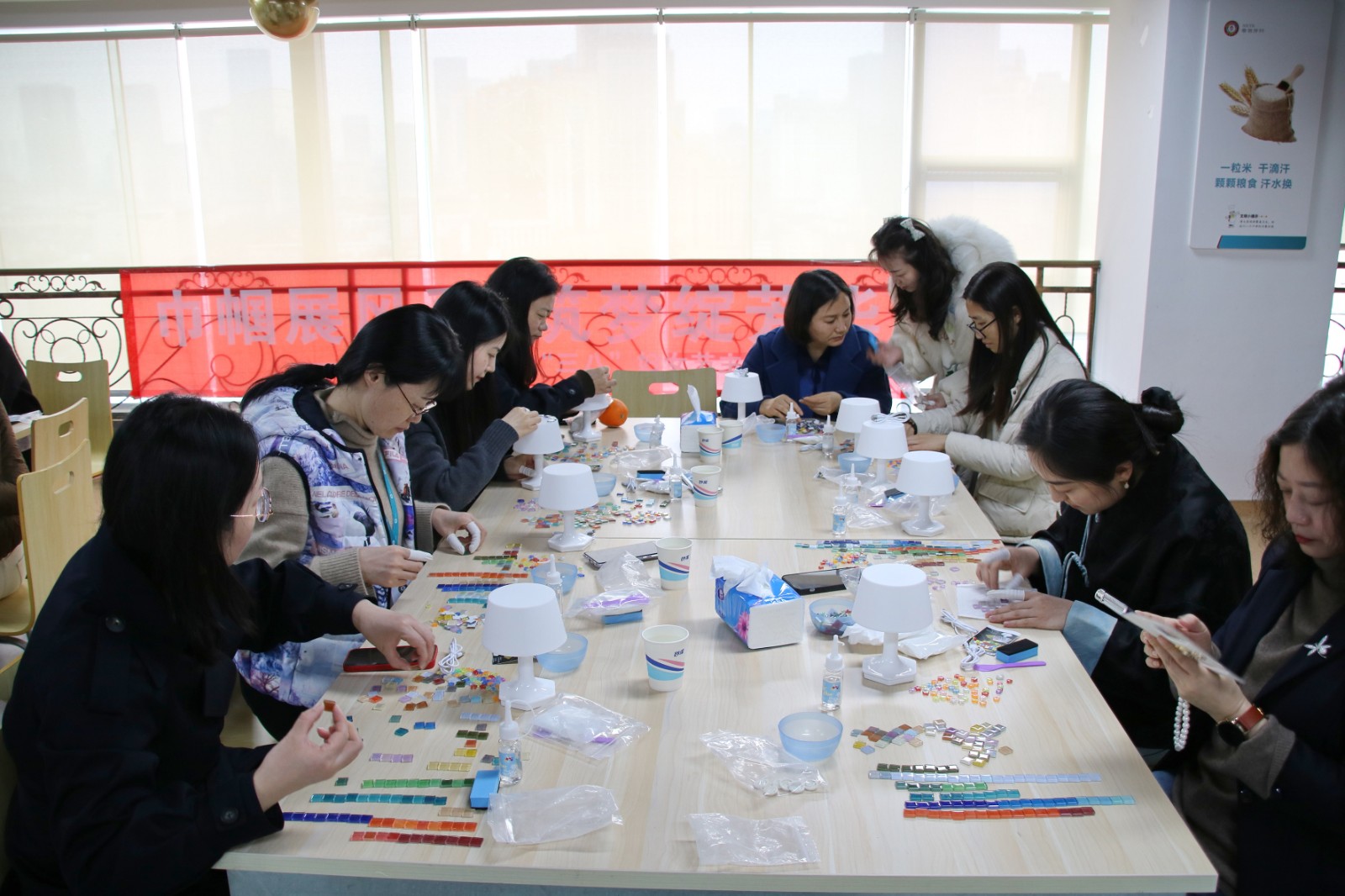 活動中,女職工們首先了解了馬賽克藝術的起源、發(fā)展和應用,隨后沉浸在手工創(chuàng)作的樂趣中,充分發(fā)揮想象和創(chuàng)意,將不同顏色、不用形狀的玻璃片拼合組成繽紛多彩的圖案,制作出屬于自己的獨一無二的馬賽克燈。