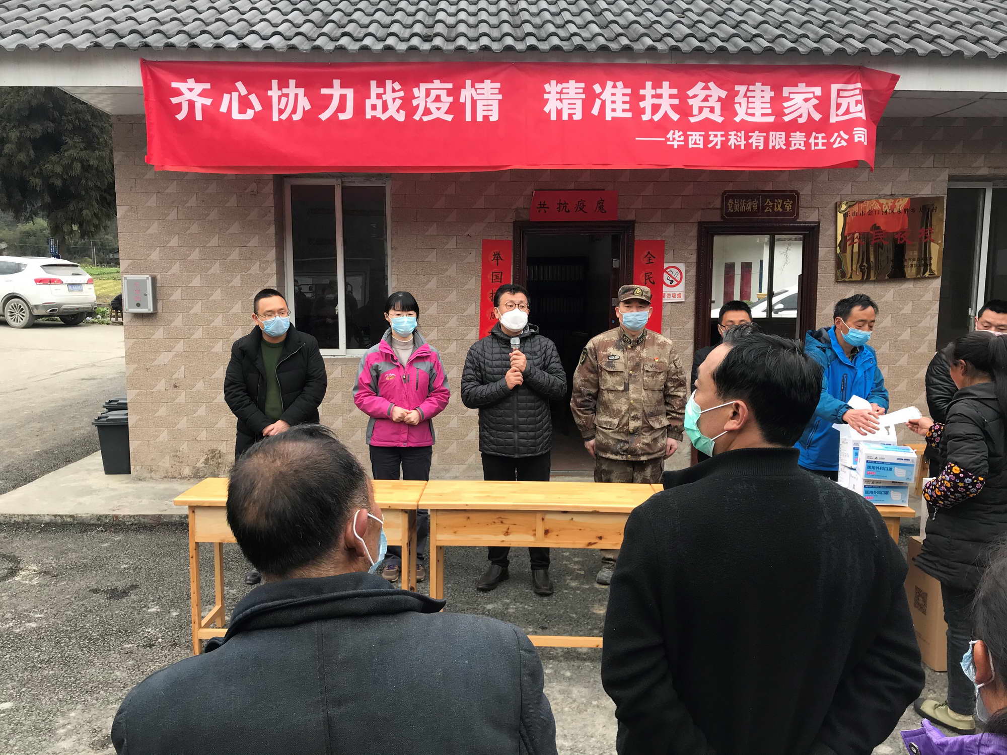 新冠肺炎疫情發(fā)生以來,華西牙科認(rèn)真履行國企政治責(zé)任,堅(jiān)決貫徹落實(shí)省委省政府和集團(tuán)公司決策部署,密切關(guān)注定點(diǎn)幫扶對(duì)象樂山市金口河區(qū)永勝鄉(xiāng)大坪村的疫情防控工作情況,心系大坪村父老鄉(xiāng)親們的生產(chǎn)生活。2020年3月17日,華西牙科總經(jīng)理關(guān)志強(qiáng)、黨委副書記、紀(jì)委書記金晶、辦公室主任朱倫倫、四川口院頜面外科護(hù)士長吳玉紅等一行7人,來到金口河區(qū)大坪村開展對(duì)口幫扶活動(dòng)。金口河區(qū)武裝部政委原春林、永勝鄉(xiāng)鄉(xiāng)長梁德祥、永勝鄉(xiāng)人大主席王立春、大坪村支部書記張豐奎、副書記陳永林及大坪村80余名村民參加活動(dòng)。