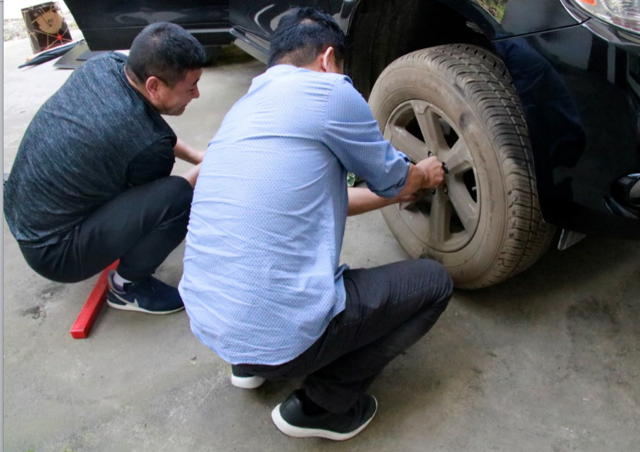 當(dāng)天上午9點(diǎn),扶貧小組從川投大廈出發(fā),經(jīng)過近5個(gè)小時(shí)的車程后,在距離大坪村約7公里的村道上,車的左前輪被一顆螺絲釘扎破。考慮到時(shí)間緊迫,任務(wù)繁重,關(guān)志強(qiáng)總經(jīng)理當(dāng)機(jī)立斷決定自行換車胎,他率先垂范,不怕臟不怕累,親自拆裝輪胎。在大家的共同配合下,不到20分鐘的時(shí)間就完成了輪胎的拆卸、安裝和充氣,隨后再次踏上前往大坪村的路途。