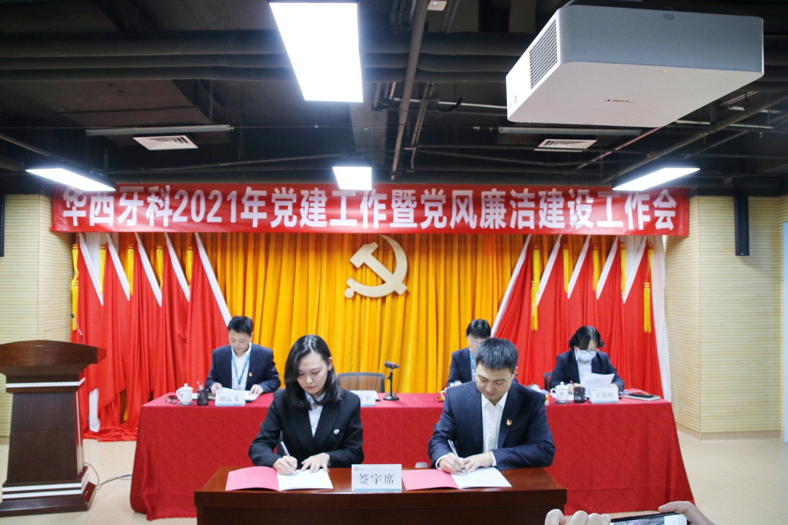 會上,金晶副書記傳達了川投集團2021年黨建工作會及黨風廉政建設工作會議精神。永平書記與班子成員代表、子公司負責人代表分別簽署了《華西牙科2021年度領導班子成員黨風廉潔建設責任書》和《華西牙科2021年度子公司領導人員“雙廉”責任書》。隨后,公司黨委開展了2020年度選人用人“一報告兩評議”工作。