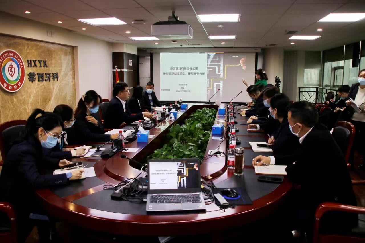 11月30日上午,華西牙科黨委在本部1501會議室召開2022年第六期“五心”講堂之藍色匠心——《投資管理制度及投資案例分析》專題培訓。華西牙科本部全體員工,所屬公司全體黨員、中層及以上管理人員等40余人以現場和視頻的方式參加培訓,培訓由華西牙科副總經理李景雨主持。