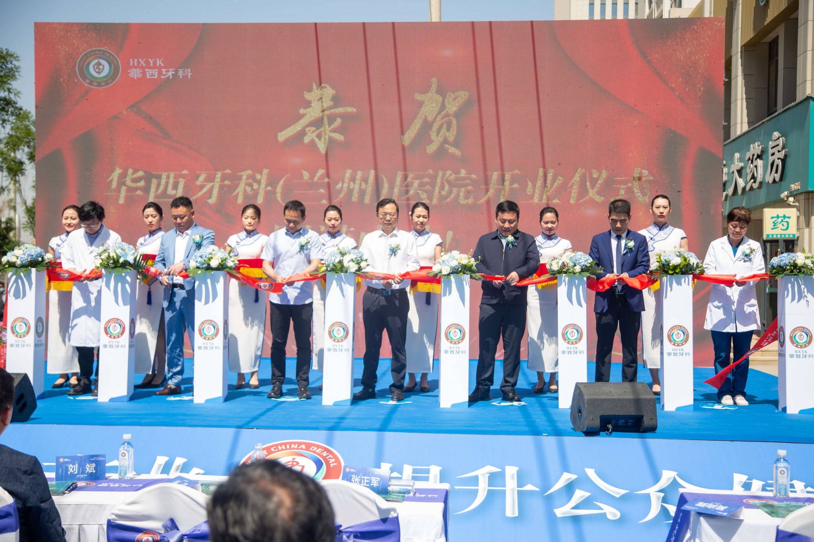 七里河區(qū)人民政府副區(qū)長劉斌,七里河區(qū)衛(wèi)生健康局黨組書記、局長張正軍,敦煌路街道黨工委書記戴巍,蘭州蘭石集團(tuán)有限公司副總經(jīng)理吳向輝,敦煌路街道黨工委副書記、辦事處主任唐仲海,甘肅藥業(yè)集團(tuán)醫(yī)藥大健康產(chǎn)業(yè)發(fā)展有限公司董事長蔣波,西北民族大學(xué)醫(yī)學(xué)部黨委書記郭力,白銀陽明實(shí)業(yè)集團(tuán)有限公司董事長路發(fā)明,甘肅省川渝商會(huì)會(huì)長吳建華,甘肅愛爾眼視光醫(yī)院甘青寧大區(qū)CEO方軍,蘭州蘭石房地產(chǎn)開發(fā)有限公司黨委書記、總經(jīng)理李元中,華西牙科黨委委員、副總經(jīng)理劉云戈,總經(jīng)理助理朱倫倫以及華西牙科相關(guān)部門負(fù)責(zé)人出席儀式。