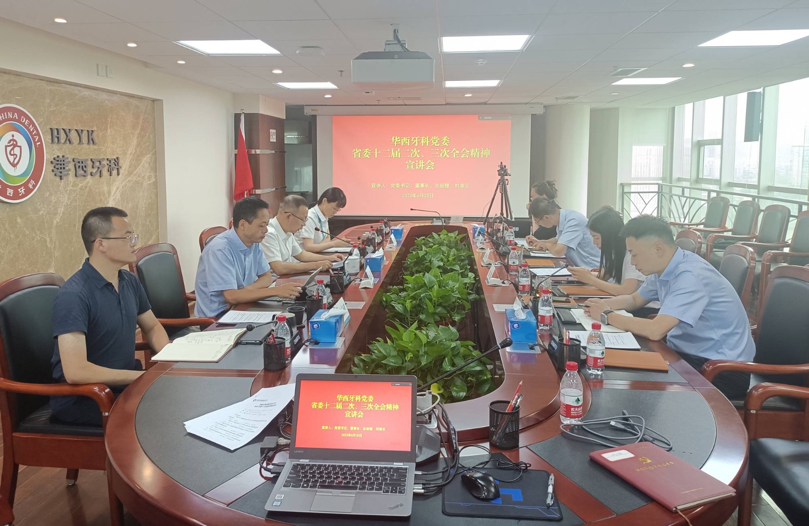 6月20日,華西牙科黨委組織召開專題會議,傳達學(xué)習(xí)省委十二屆二次、三次全會精神。華西牙科黨委書記、董事長、總經(jīng)理劉凌云主持會議,黨委副書記、工會主席金晶,黨委委員、副總經(jīng)理劉云戈,副總經(jīng)理李景雨以及各黨(總)支部書記、支部委員15人參加會議。