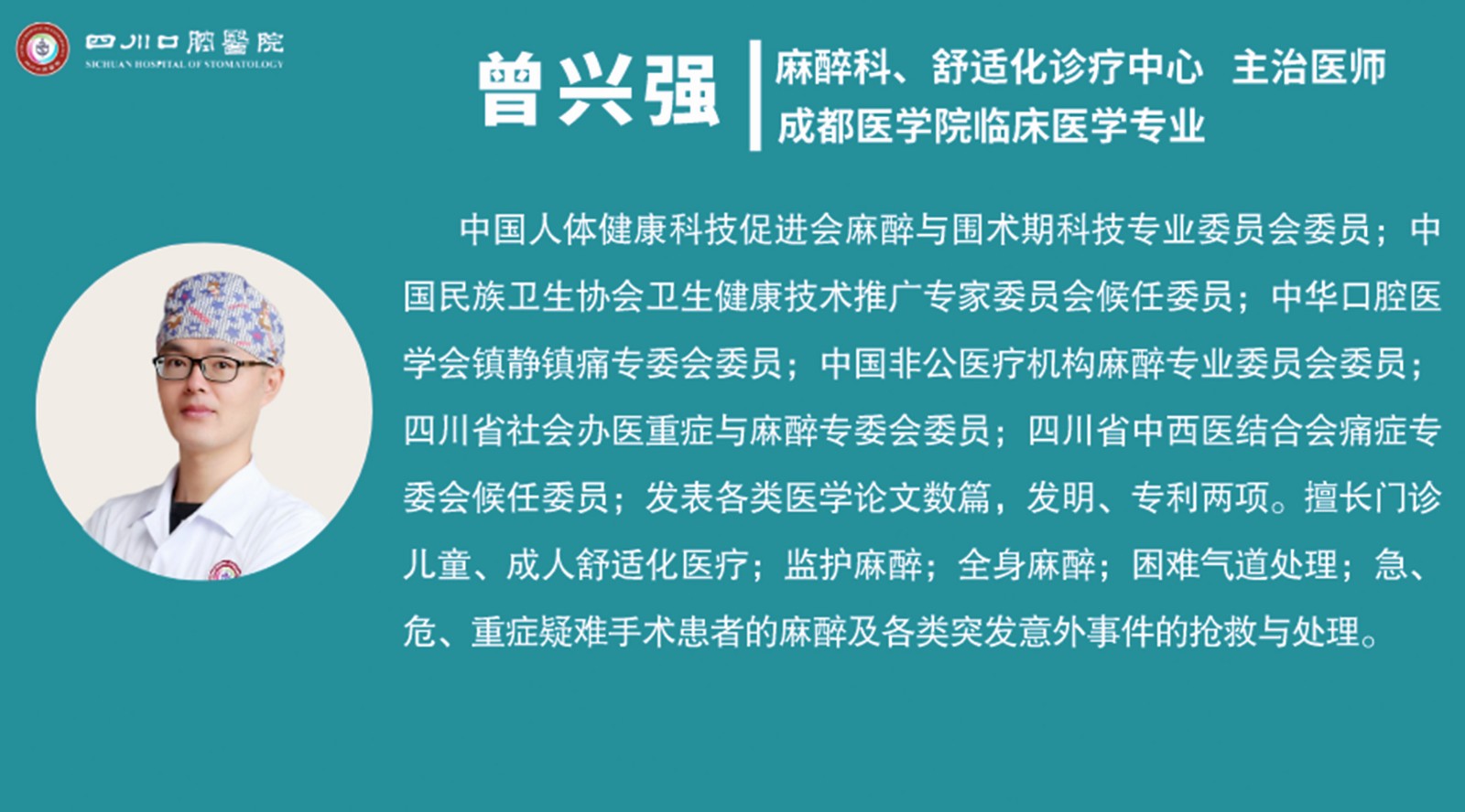 近期,根據(jù)成都市青羊區(qū)衛(wèi)生健康局公布的青羊區(qū)區(qū)級醫(yī)療質量控制中心專家委員名單,四川口腔醫(yī)院舒適化診療中心、麻醉科主任、副主任醫(yī)師曾興強憑借其豐富的臨床經(jīng)驗、精湛的醫(yī)療技術,入選青羊區(qū)臨床麻醉質量控制中心專家委員名單。