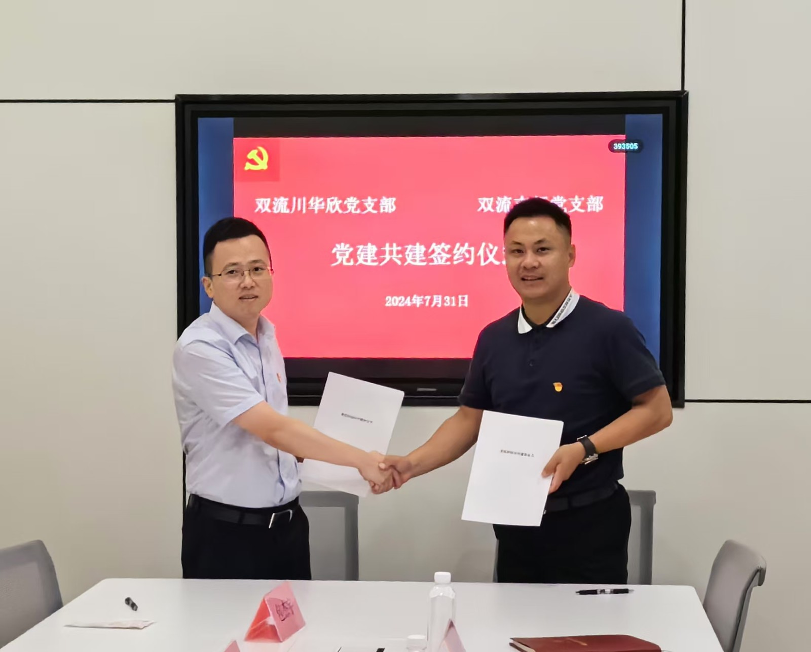 雙流川華欣黨支部副書記周揚鑫、四川銀行雙流支行黨支部書記凌胤欽出席簽約儀式并代表雙方簽署“黨建結對共建活動”協(xié)議書。