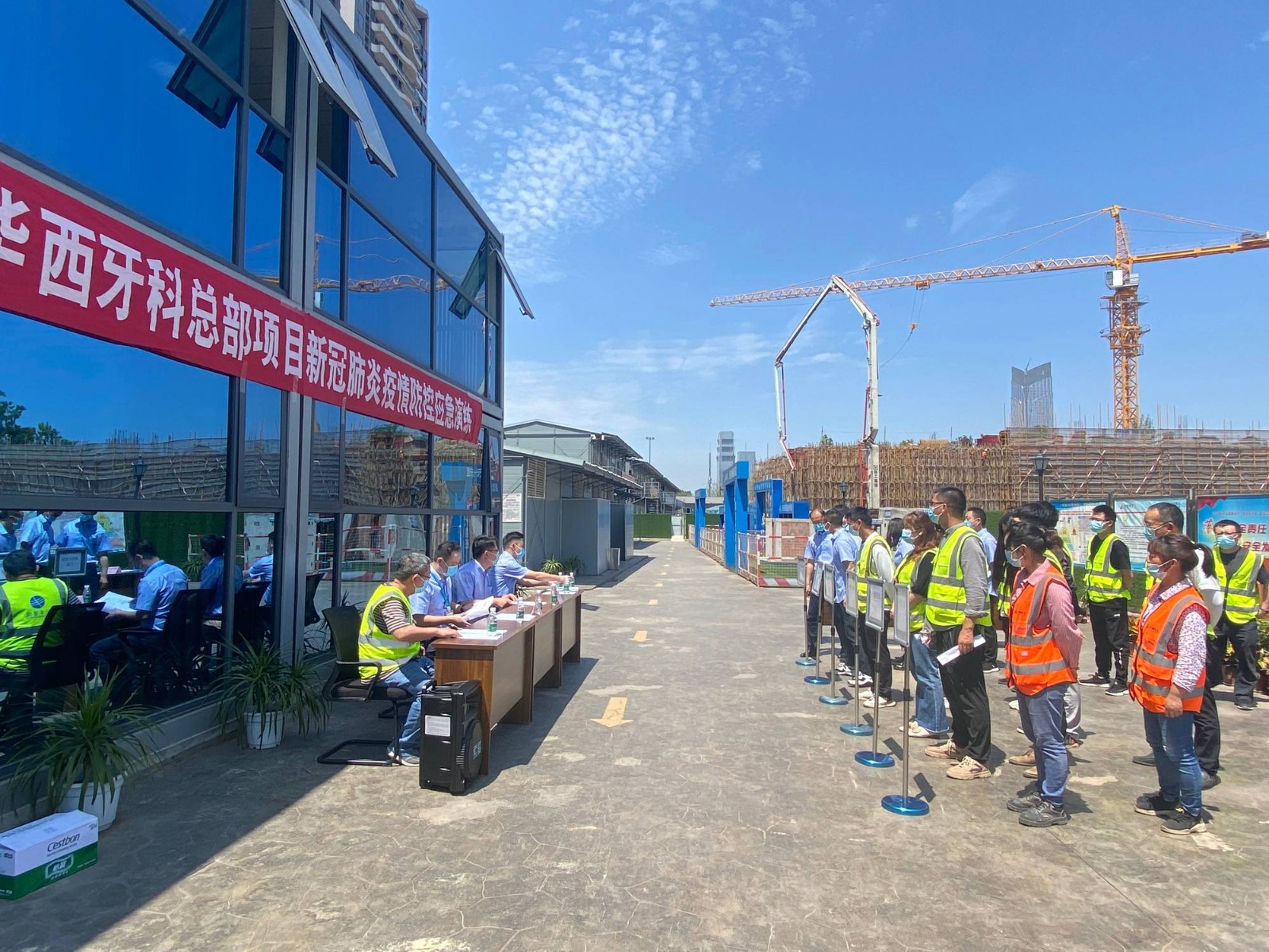 為提高項(xiàng)目建設(shè)工地應(yīng)對(duì)新冠肺炎疫情的應(yīng)急處置能力,加強(qiáng)各部門(mén)、單位之間的協(xié)調(diào)配合。4月25日下午,華西牙科總部項(xiàng)目施工現(xiàn)場(chǎng)組織開(kāi)展了疫情防控應(yīng)急演練,華西牙科副總經(jīng)理李景雨,天府華西牙科公司執(zhí)行董事、總經(jīng)理蘭吉、副總經(jīng)理葉曙光、施工單位項(xiàng)目經(jīng)理、監(jiān)理單位駐場(chǎng)總監(jiān)等43人參加演練。