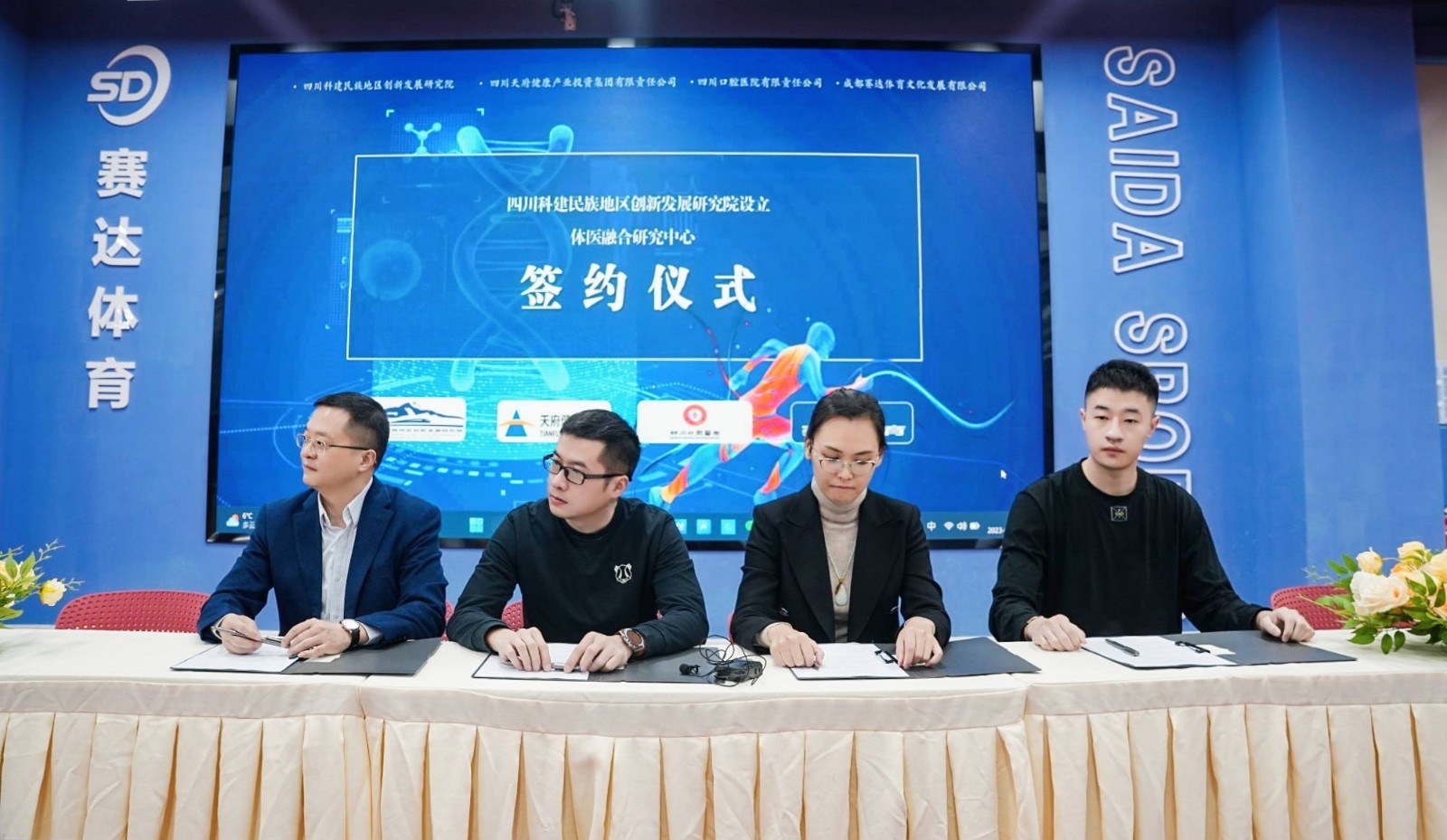 為深入貫徹落實《“健康中國2030”規(guī)劃綱要》,推動體育和醫(yī)學(xué)多維度、深層次結(jié)合,實現(xiàn)全民體育、全民健身的目標(biāo)。1月7日,由四川口腔醫(yī)院、四川科建民族地區(qū)創(chuàng)新發(fā)展研究院、四川天府健康產(chǎn)業(yè)投資集團(tuán)有限責(zé)任公司、成都賽達(dá)體育文化有限公司共同發(fā)起設(shè)立的“體醫(yī)融合研究中心”合作簽約儀式在成都賽達(dá)乒乓球俱樂部舉行。四川口腔醫(yī)院常務(wù)副院長向彩榮,四川科建民族地區(qū)創(chuàng)新發(fā)展研究院院長云智,四川天府健康產(chǎn)業(yè)投資集團(tuán)有限責(zé)任公司總經(jīng)理張一帥,成都賽達(dá)體育文化有限公司執(zhí)行董事長李冠銑出席簽約儀式。