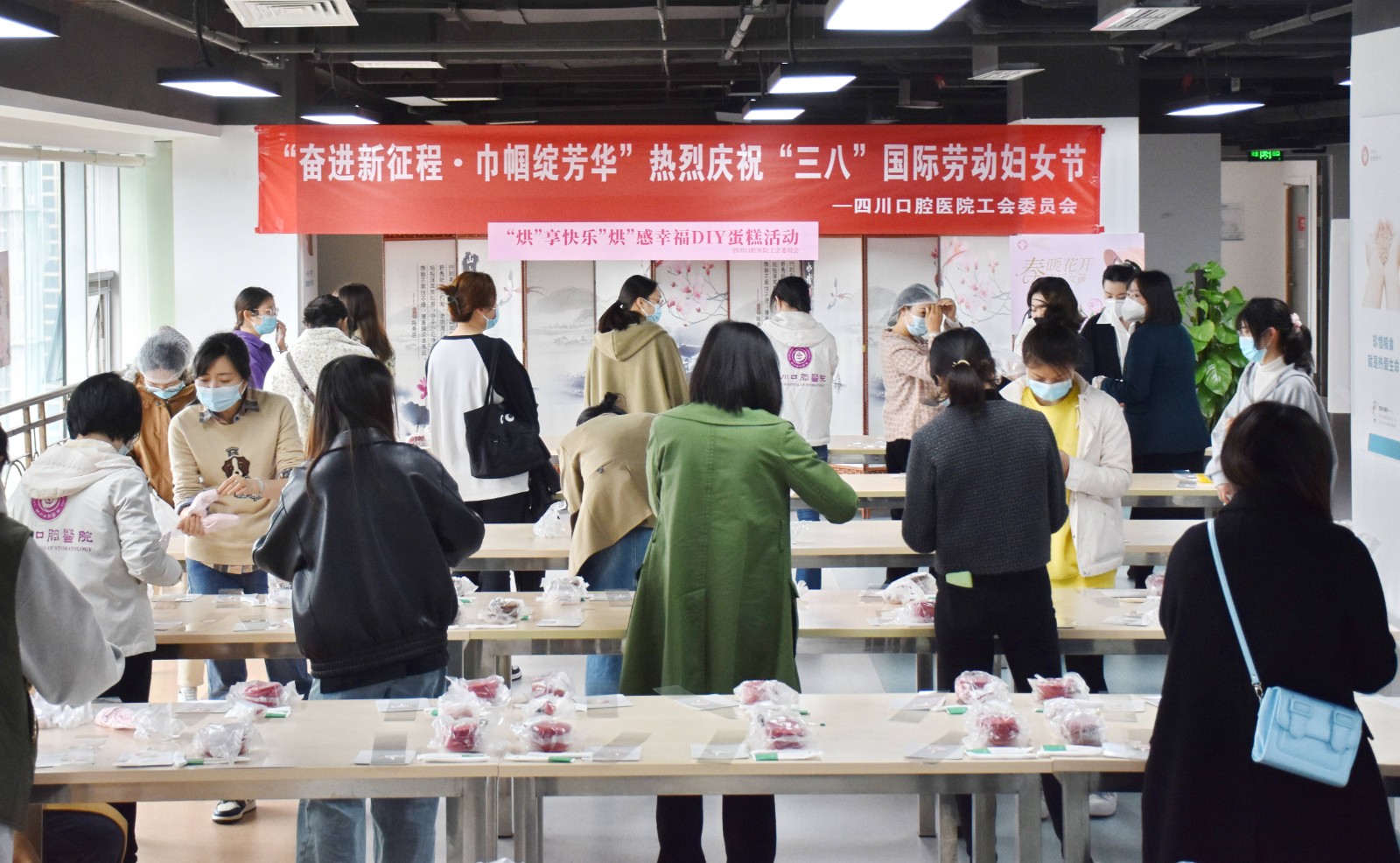 人間最美三月天,春花爛漫展新顏。在第113個“三八”國際勞動婦女節(jié)來臨之際,為豐富醫(yī)院女職工的精神文化生活,增強女職工的團結(jié)凝聚力。3月7日下午,四川口腔醫(yī)院工會在16樓職工活動室組織開展了以“奮進新征程·巾幗綻芳華”為主題的“烘”享快樂,“焙”感幸福DIY蛋糕活動,共120余名女職工參加。