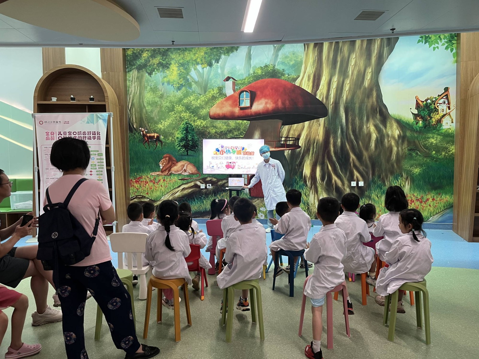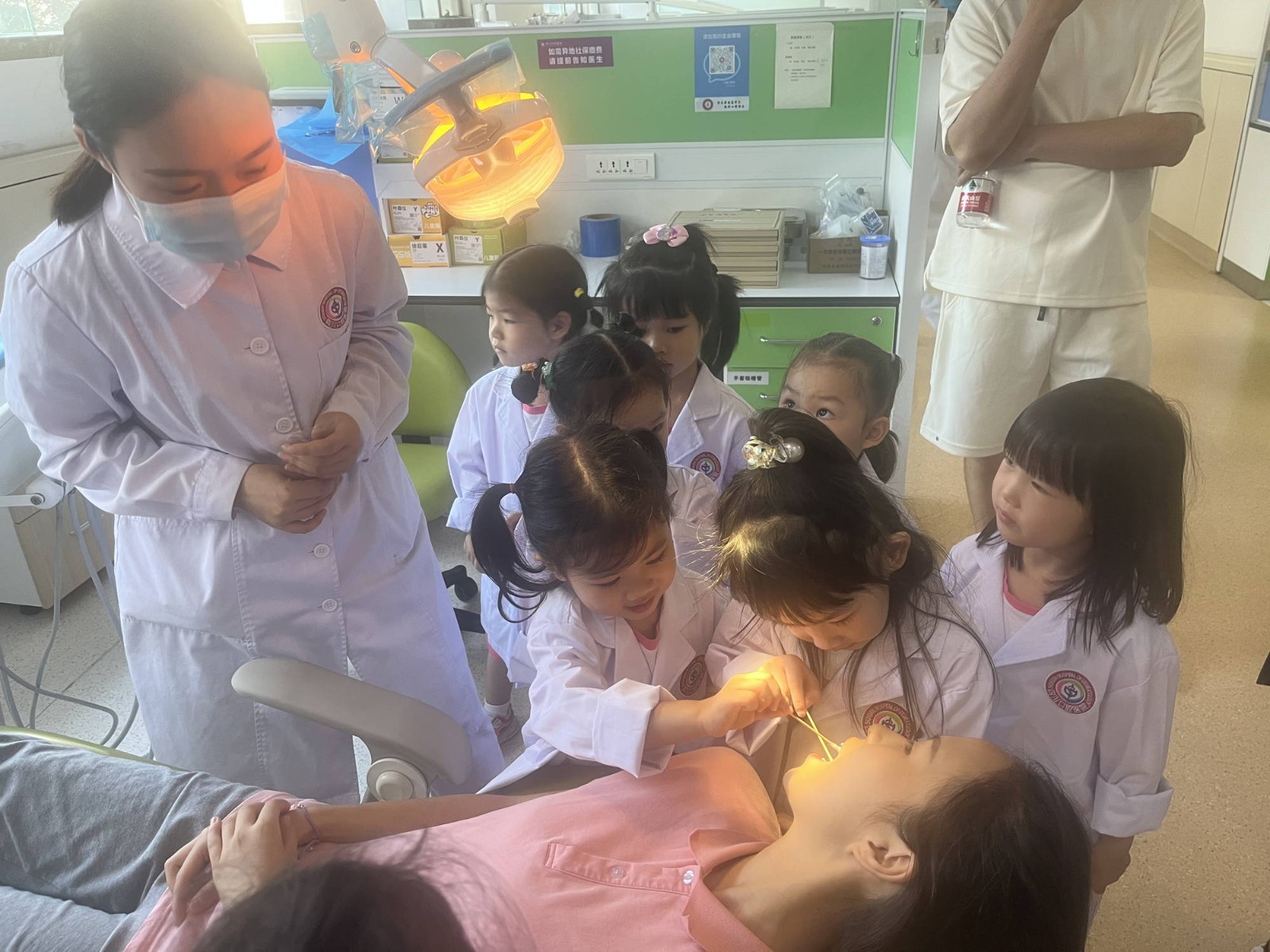 活動(dòng)從生動(dòng)有趣的愛(ài)牙護(hù)齒微課堂開(kāi)始,四川口腔醫(yī)院醫(yī)生運(yùn)用牙齒結(jié)構(gòu)模具為小朋友們講解了齲齒的形成與預(yù)防、口腔結(jié)構(gòu)等保健知識(shí),還為小朋友們講解了口腔的日常維護(hù)、正確的刷牙與飲食方式,幫助大家認(rèn)識(shí)口腔健康的重要性。小朋友們穿上白大褂,變身可愛(ài)的“小小牙醫(yī)”,走進(jìn)兒童口腔診室,在專(zhuān)業(yè)醫(yī)生和護(hù)士的指導(dǎo)下,為家長(zhǎng)和老師們檢查牙齒,體驗(yàn)做一名“小小牙醫(yī)”的樂(lè)趣。